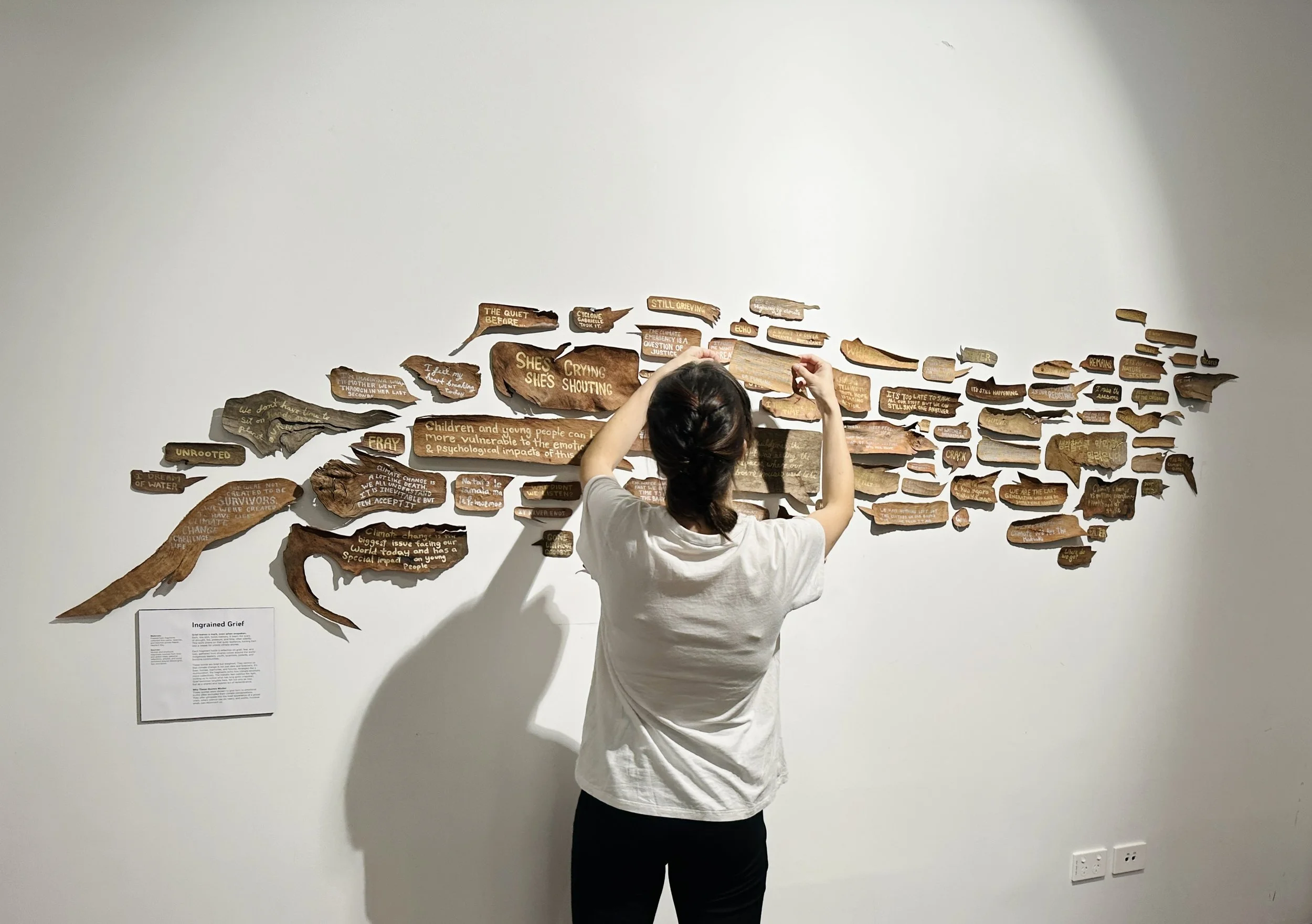 Like skin, bark holds memory, scars from drought, fire, pressure, and time. This work draws on that quiet resilience, turning bark into a vessel for untold climate stories. Each fragment reflects grief, fear, or loss, gathered from voices around the world: Indigenous leaders, youth, scientists, parents, and frontline communities. These brief words carry weight. They remind us climate change isn’t just data, it’s lives, homes, memories, and futures.