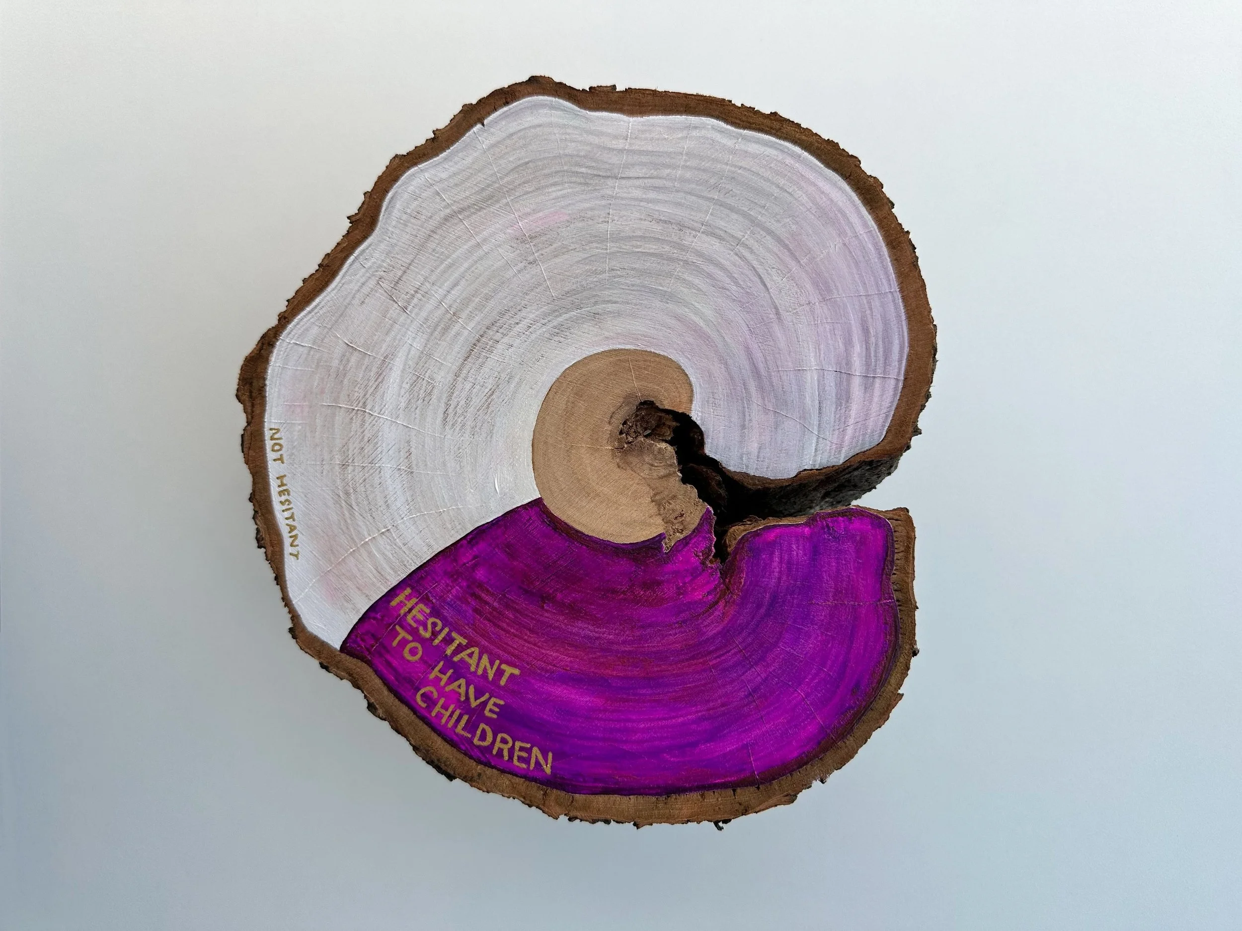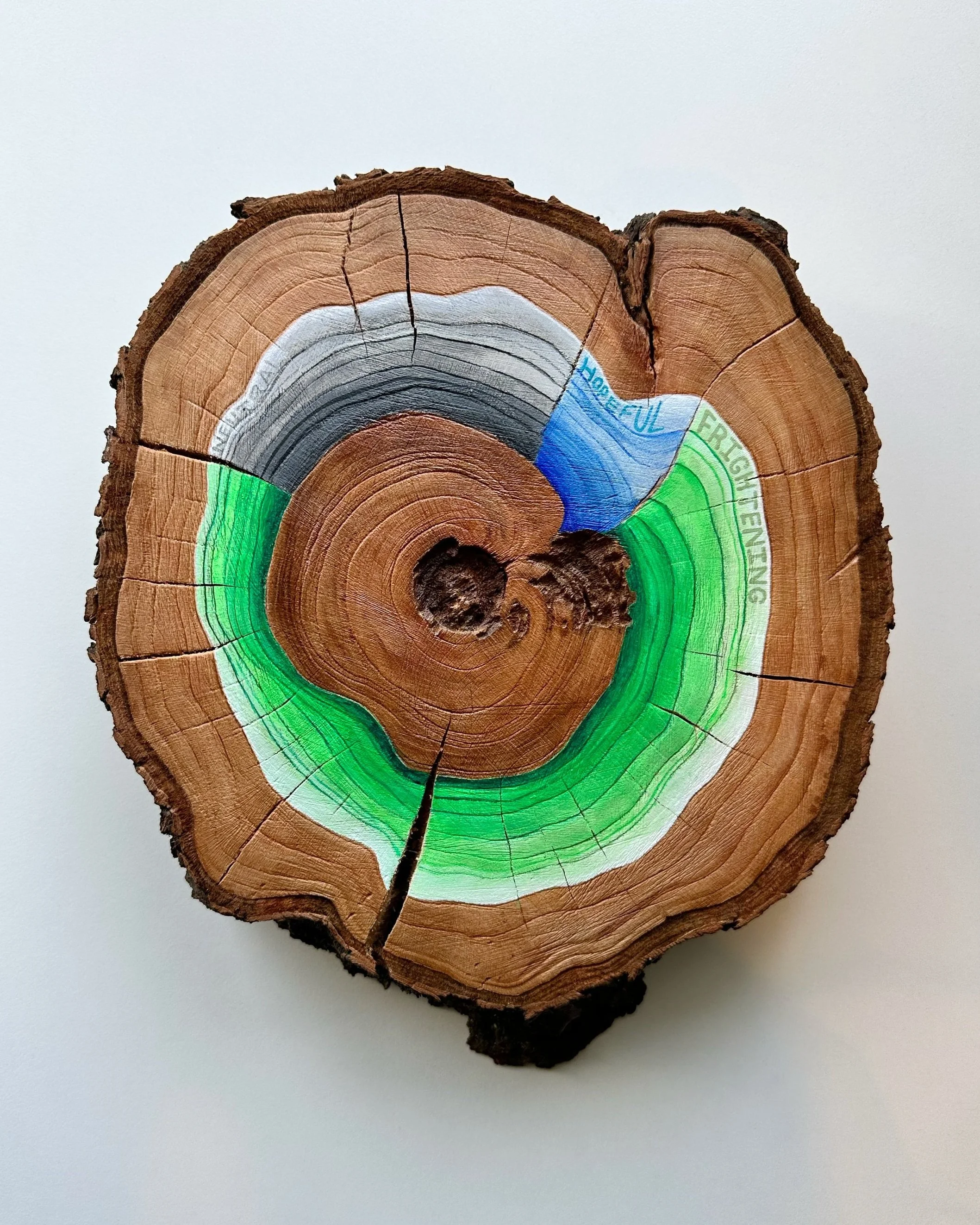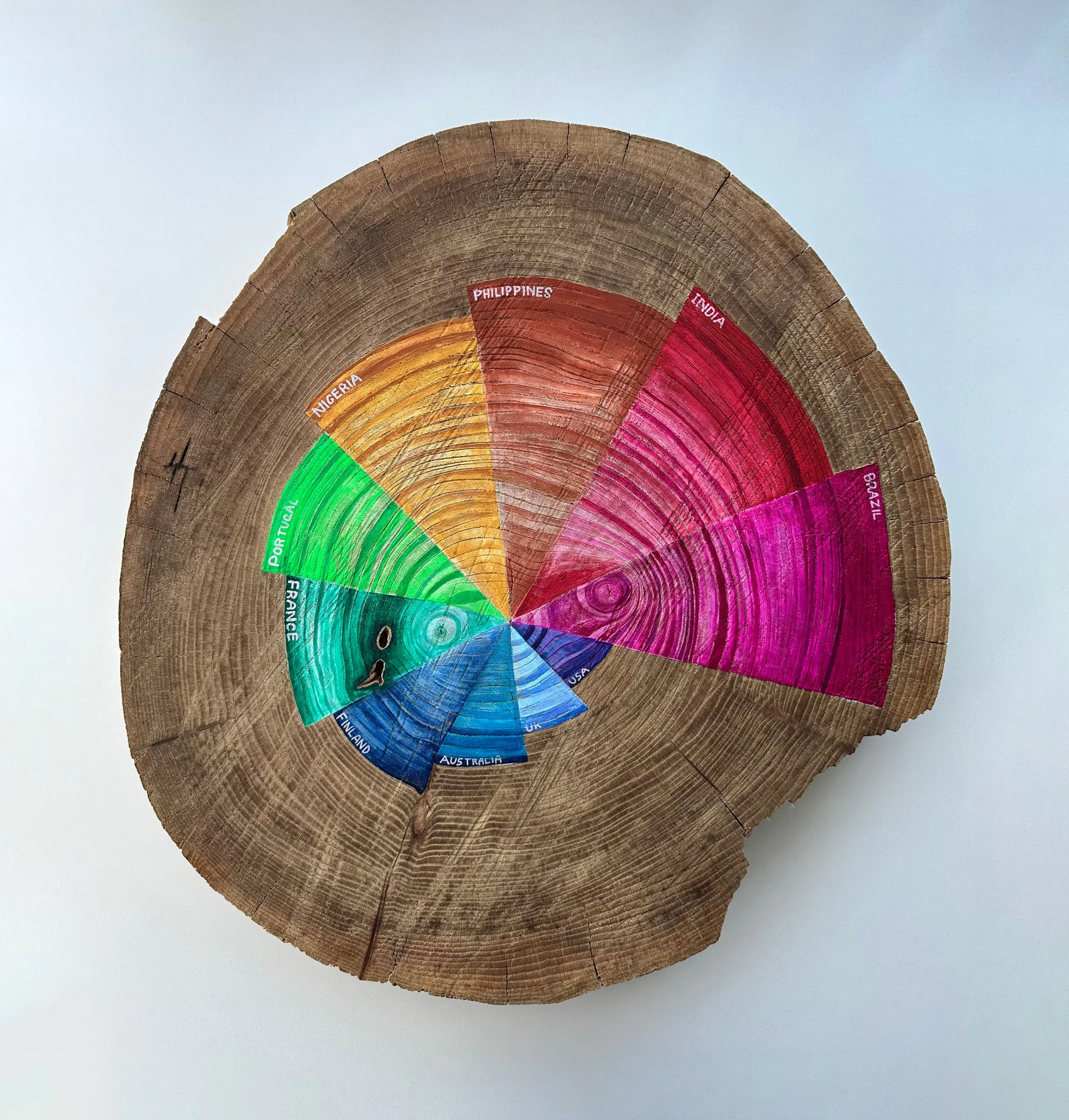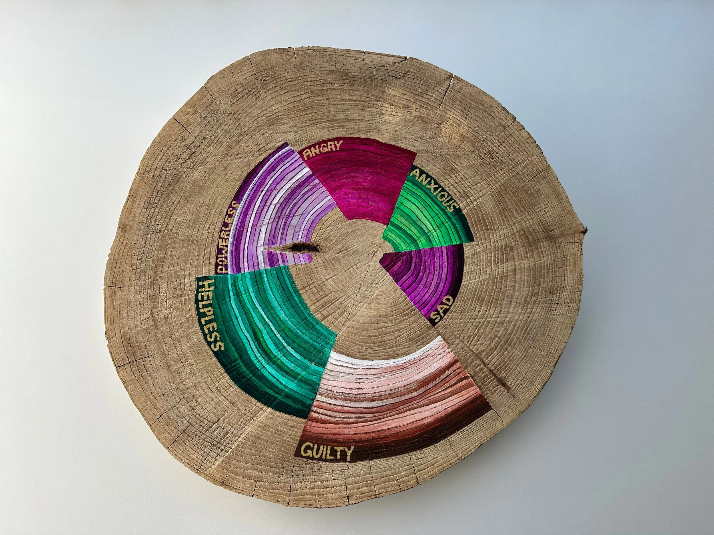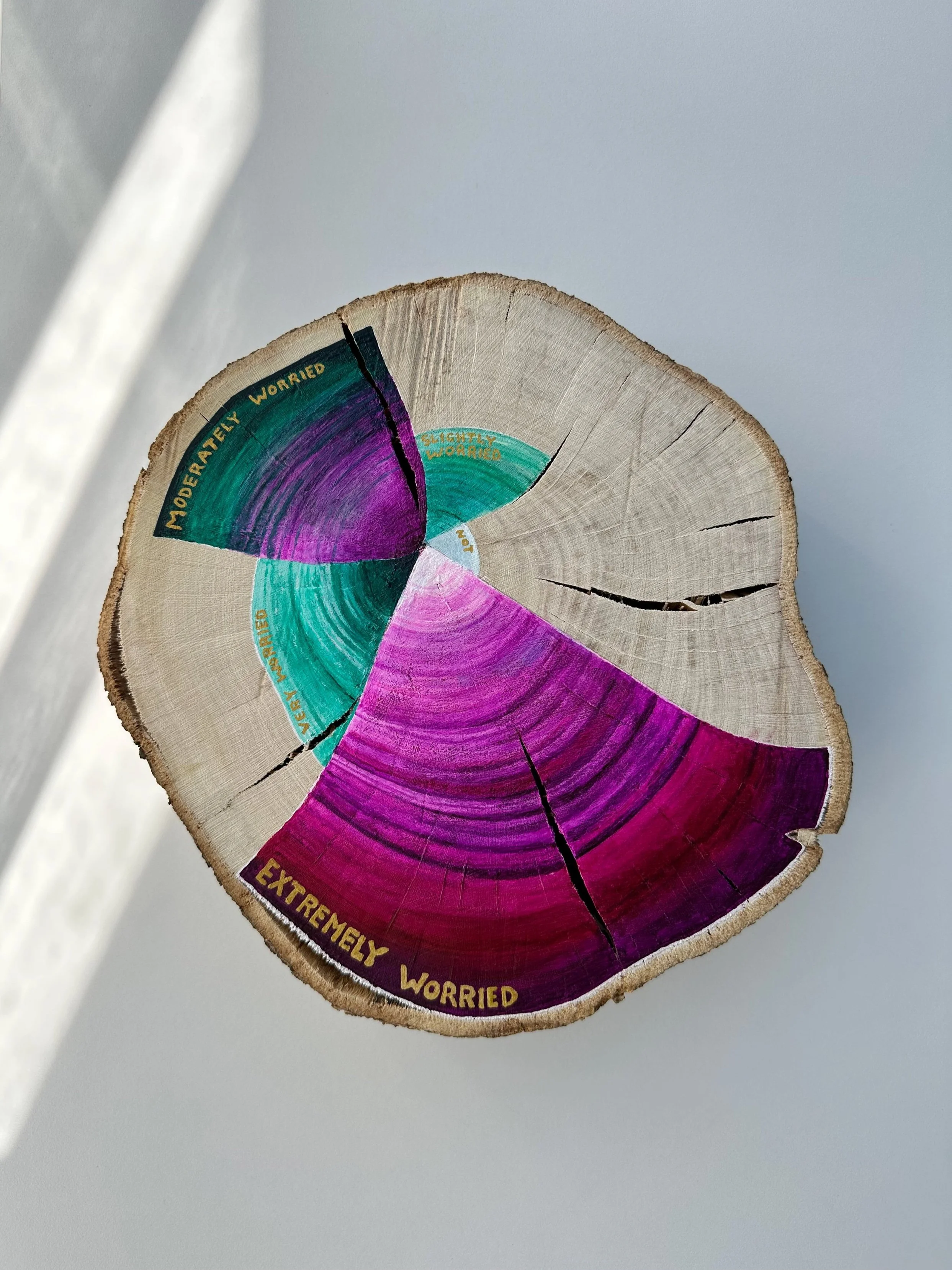 These tree cross-sections hold more than time. They carry the slow accumulation of unspoken change, a time before knowing. Each painted ring visualises climate emotions: fear, anxiety, anger, hope, shaped by real data, real stories, and real feelings. Nature has been keeping score quietly all along. The listening has deepened and the urgency is growing. This emotional record draws from a major global study exploring how young people across ten countries are experiencing climate change. It is both deeply personal and undeniably collective. The data visualised here is explored further below.